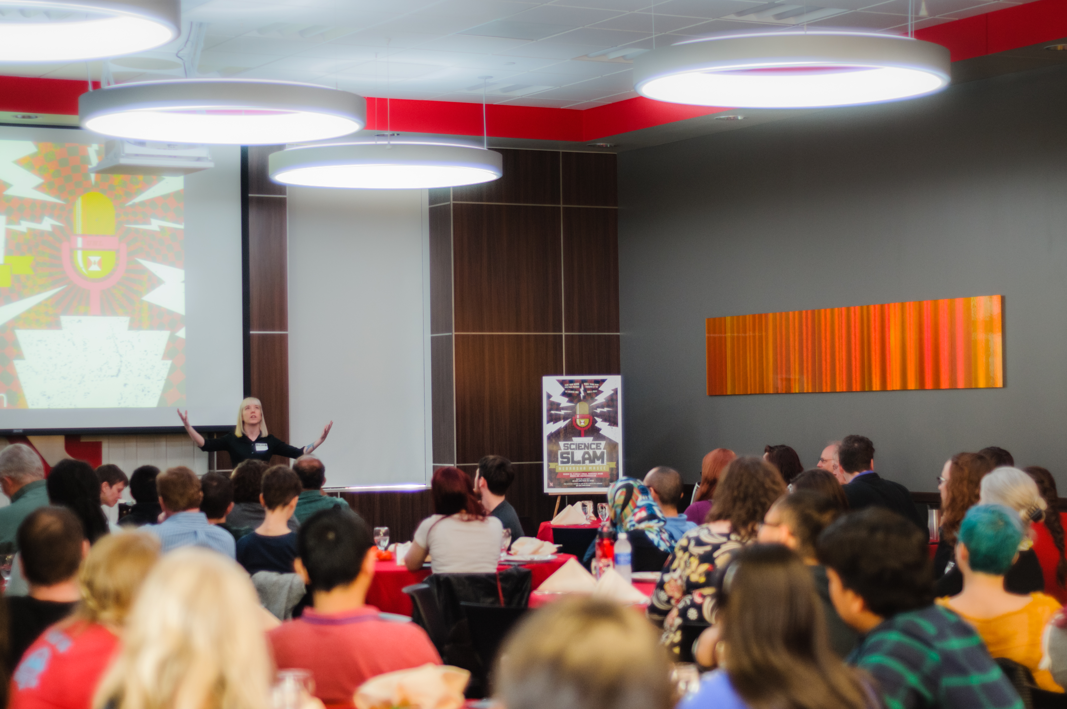 Held for the first time on March 16, 2016, on the University of Nebraska-Lincoln (UNL) campus, Science Slams is a new signature activity for the Nebraska MRSEC education and outreach program, and a first-of-its-kind event in the United States. The goal of Science Slams is to encourage undergraduate and graduate students to widen their focus beyond the results of their immediate research, making these results understandable and meaningful to a broad audience in a concise and engaging way. The varied academic backgrounds of the speakers and audience members forced the speakers, or slammers, to discuss their work in ways that would communicate the excitement of their research to a diverse audience. The audience had an all-important role to play in deciding the outcome of the Slam, with their votes determining the winner, who received a cash prize.